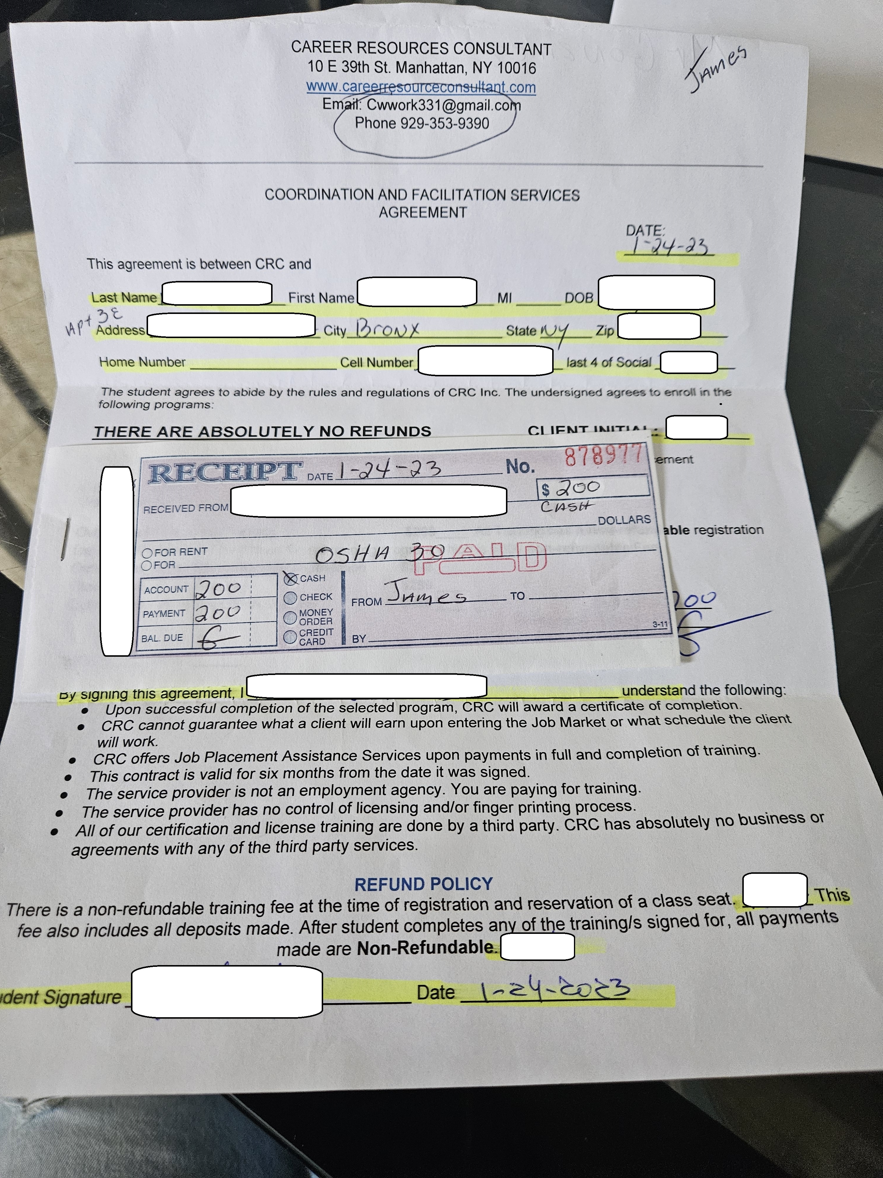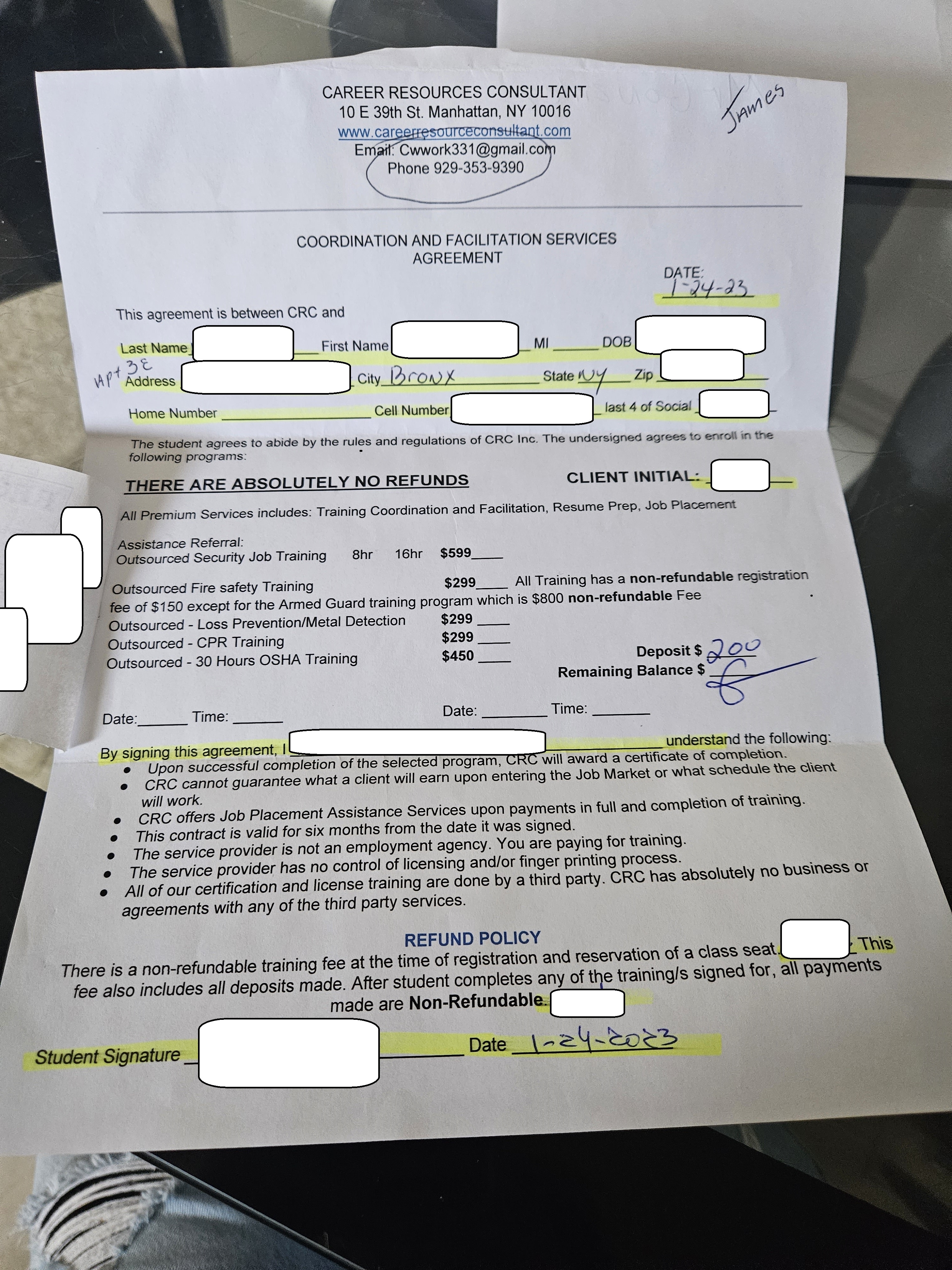 Upon paying the deposit or full amount, you'll be scheduled to go to a security class. This is at a real security school as your deposit paid for it, and you'll get your license in the mail upon completion. When you get your license, you are to go back to Career Resources Consultant's office to pay the remaining $450 to get your free job placement.